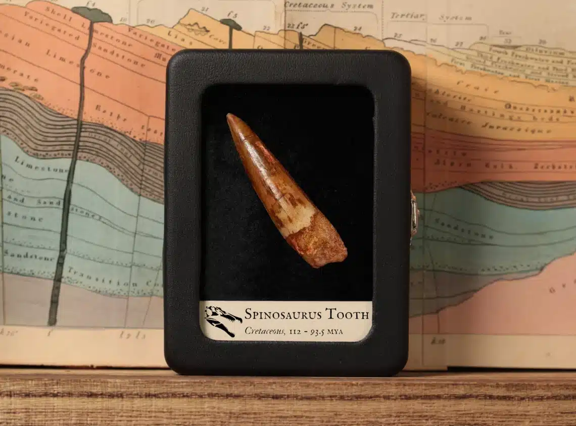 Dieser uralte Zahn, ausgegraben aus den Kreidezeit-Sedimenten der marokkanischen „Kem Kem Beds“ und zwischen 112 und 93,5 Millionen Jahre alt, trägt die Spuren einer fernen Zeit, als riesige Kreaturen die Erde durchstreiften.